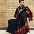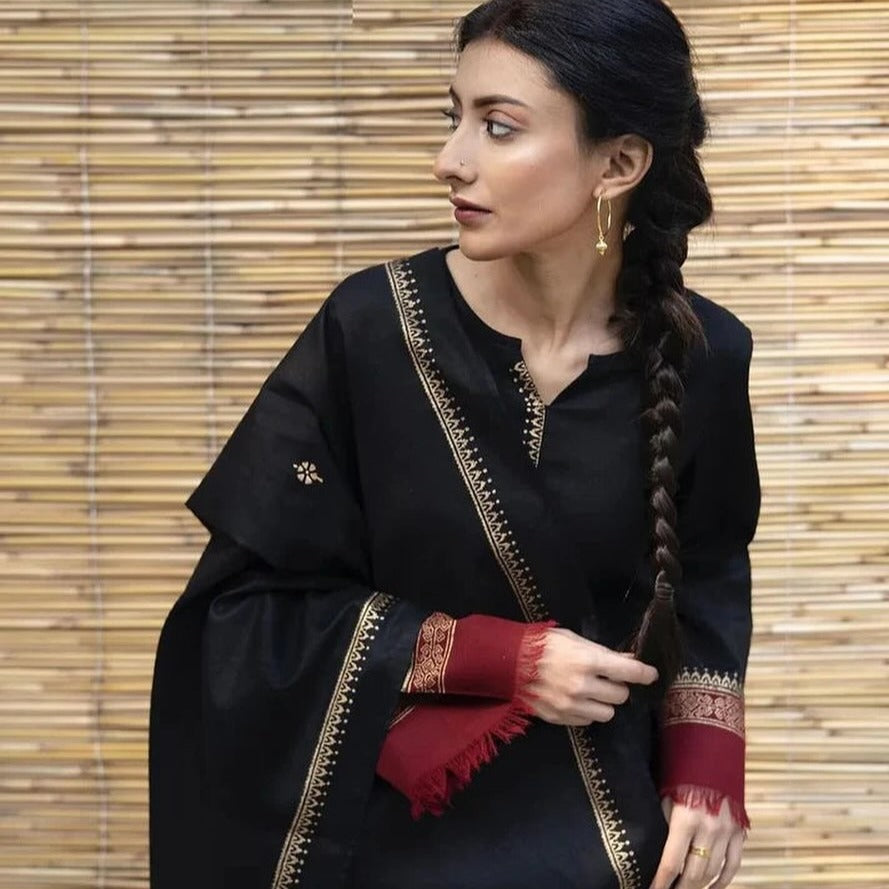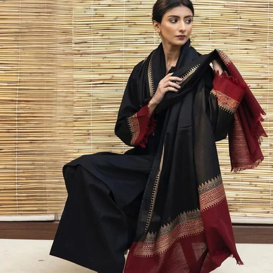 3PC FINE MARINA DRESS WITH BLOCK PRINTED SHAWL DONE ON SHIRT AND SLEEVES